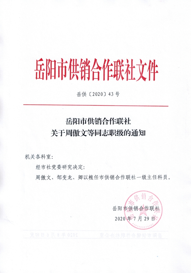 岳阳市供销合作联社关于周傲文等同志职级的通知