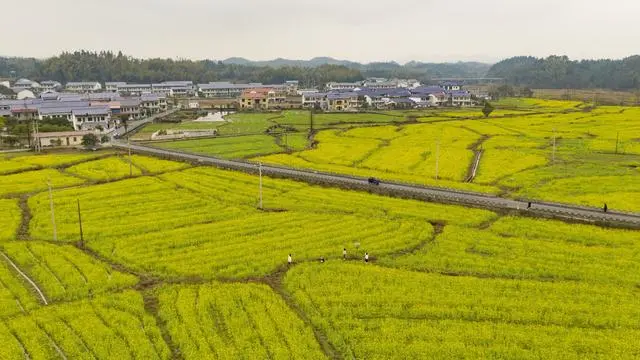 资料图:江西新余,油菜花绽放,农机在花海中翻耕土地