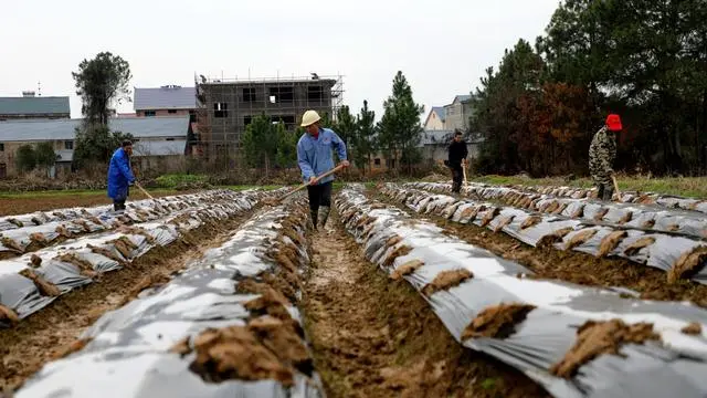 资料图:2023年2月14日,在江西省吉安市峡江县马埠镇朱家村,农民在摊铺薄膜