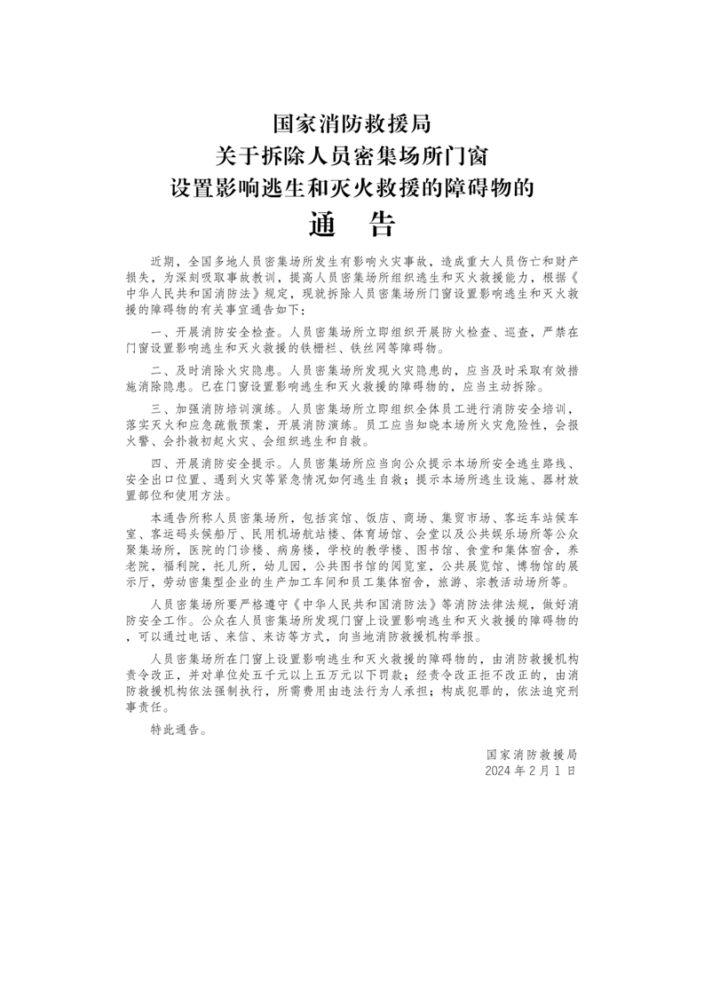 国家消防救援局关于拆除人员密集场所门窗设置影响逃生和火火救援的障得物的通告