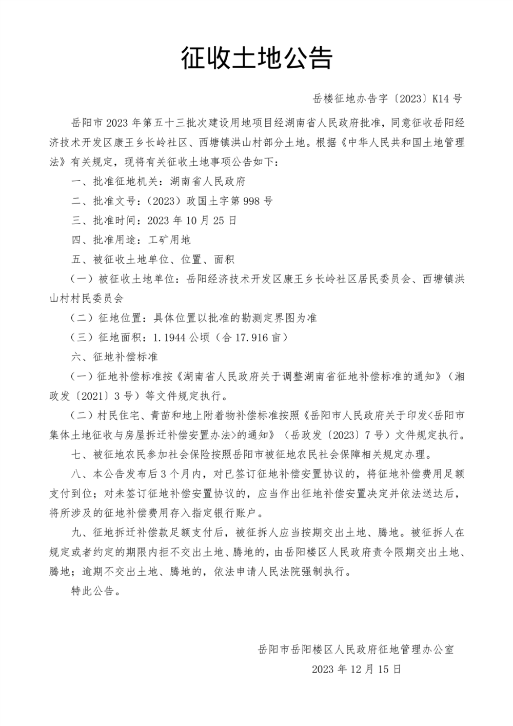征收土地公告(2023年53批次)