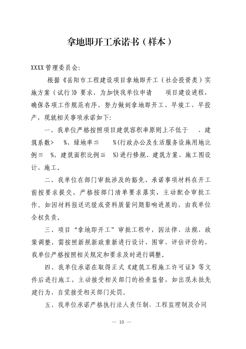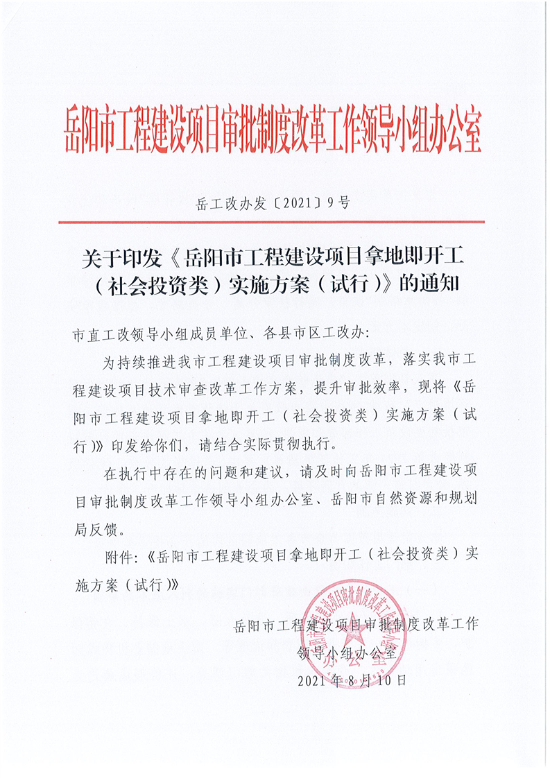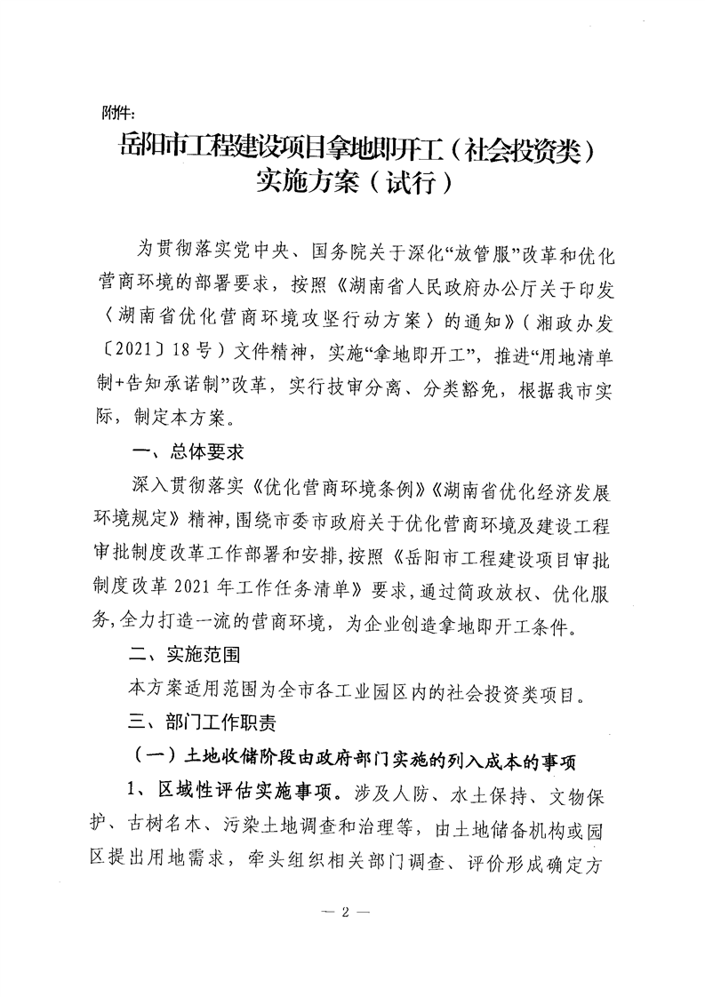 关于印发《岳阳市工程建设项目拿地即开工(社会投资类)实施方案(试行)》的通知