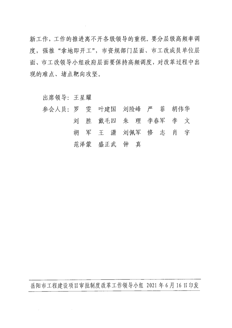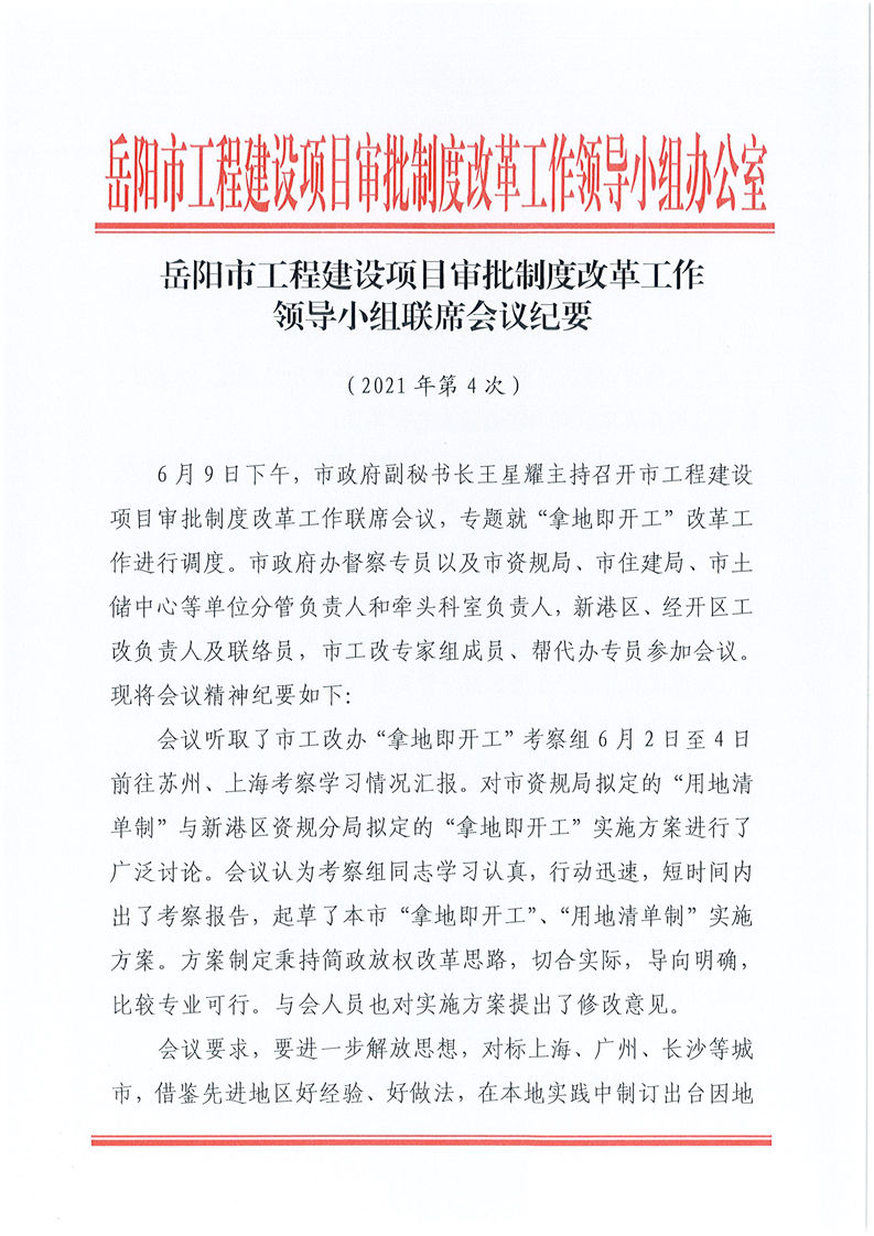 岳阳市工程建设项目审批制度改革工作领导小组联席会议纪要(2021年第4次)