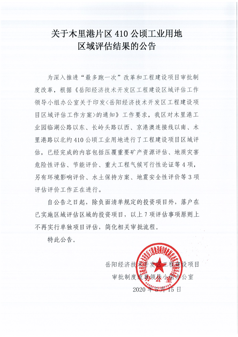 岳阳经济技术开发区关于木里港片区410公顷工业用地区域评估结果的公告