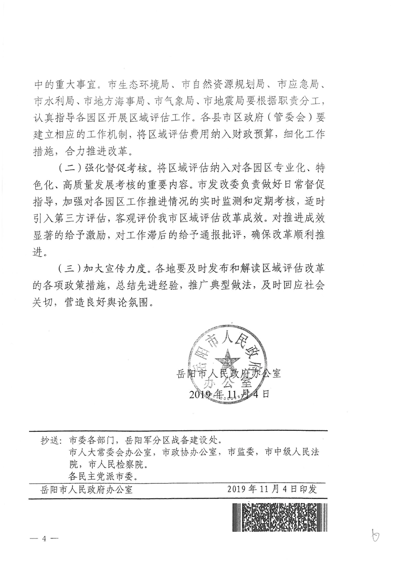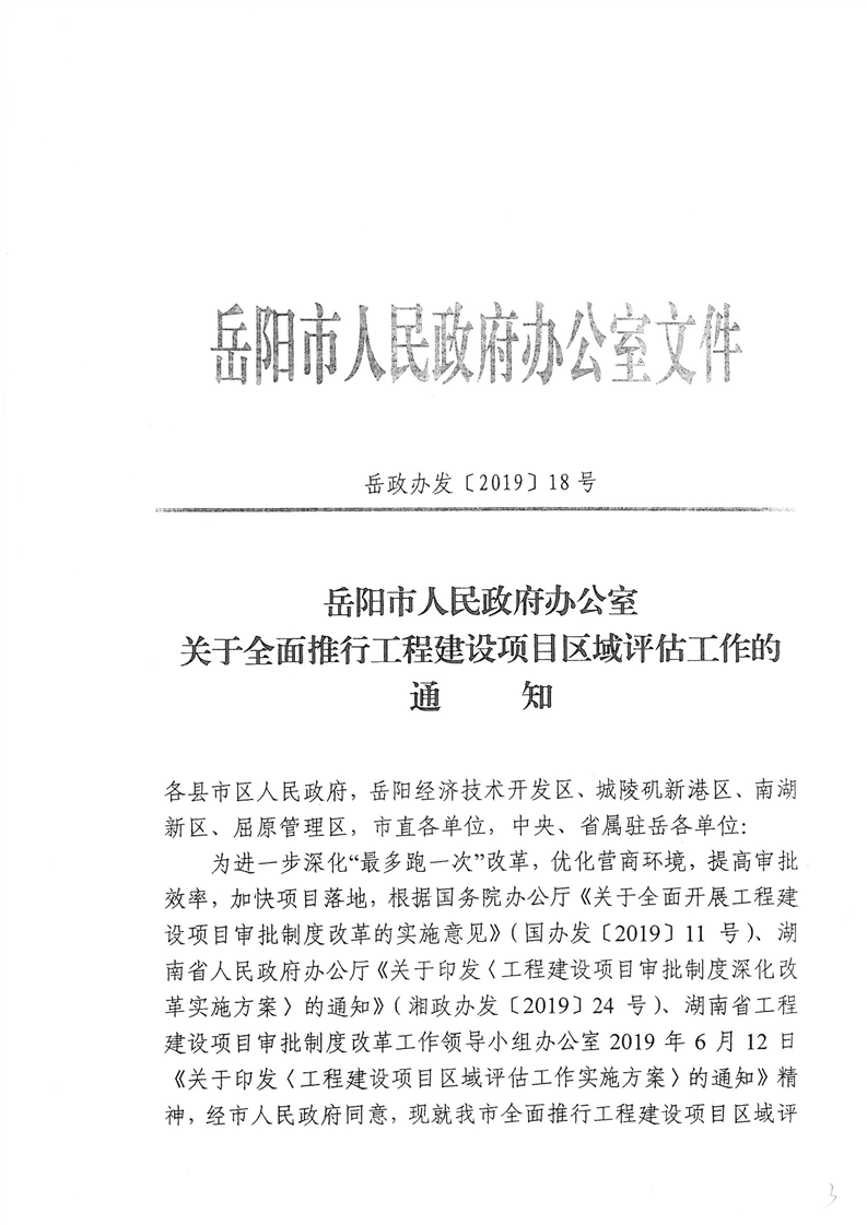 岳阳市人民政府办公室《关于全面推行工程建设项目区域评估工作的通知》(岳政办发〔2019〕18号)