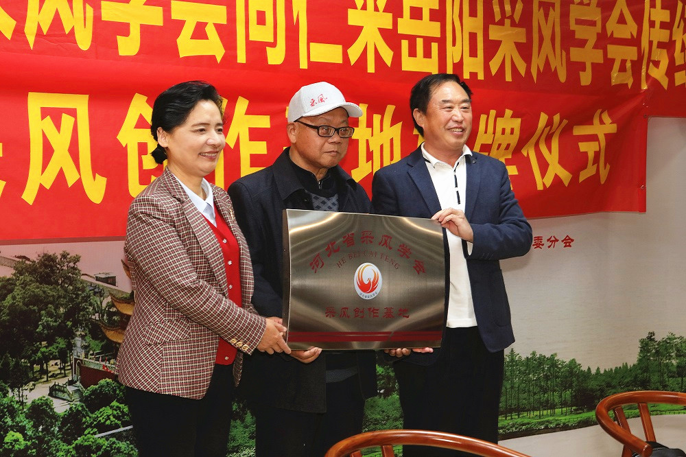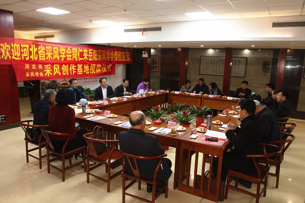 座谈会上,岳阳市采风学会执行会长刘衍清介绍了岳阳市采风学会成立以来的情况;河北省采风学会执行 会长张炳吉介绍了河北省采风学会10年来的建设情况。会议认为,两家采风学会应当共同贯彻好、落实好习近平总书记提出的“好好采风”的重要指示精神,加强联络合作,促进双方发展;会议一致同意,河北、岳阳两个采风学会结为友好单位,定期交流采风业务,互在对方设立采风创作基地。根据河北省采风学会的决定,张炳吉向刘衍清颁发了河北省采风学会岳阳采风基地主任的聘书以及河北省采风学会岳阳创作基地的牌匾;岳阳市文艺家向河北文友赠送了自己创作的书画作品。任欣欣希望两个采风学会坚持以习近平新时代中国特色社会主义思想为指导,认真宣传阐释践行习近平文化思想,立足冀湘独特深厚的历史文化优势,加强联络、互相学习借鉴,多出精品力作;市社科联作为岳阳市采风学会的主管单位,将一如既往支持学会的工作,为繁荣冀湘文化事业多作贡献。