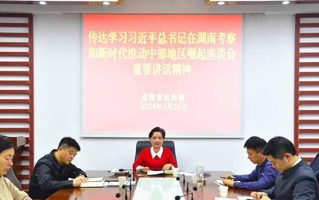 任欣欣表示:全市社科系统一定要把学习领会、宣传阐释、贯彻落实习近平总书记在湖南考察和新时代推动中部地区崛起座谈会重要讲话精神作为当前和今后一个时期的首要政治任务。一要精准领会重要讲话精神,掀起学习宣传阐释热潮。认真学习领会,搞好贯彻落实,坚定不移沿着习近平总书记指引的方向前进,切实把习近平总书记的关心厚爱和殷殷嘱托传遍巴陵大地,转化为坚持市委“1376”总体思路、建设“七个岳阳”的强大动力和实际成效,为奋力谱写中国式现代化湖南篇章贡献岳阳力量。二要紧紧围绕重要讲话精神,充分发挥新型社科智库作用,推出课题研究精品力作。重点围绕“湖南在打造三个高地上持续用力,在推动中部地区崛起和长江经济带发展中奋勇争先,奋力谱写中国式现代化湖南篇章”“新时代推动中部地区崛起”“科技创新是发展新质生产力的核心要素”“全面推进乡村振兴,扛稳洞庭湖区维护国家粮食安全的重任”“更好担负起新的文化使命,在建设中华民族现代文明中展现新作为”等集中力量开展课题研究,努力把区位优势、资源优势转化为发展胜势,为谱写中国式现代化湖南篇章贡献岳阳力量提供强有力的学理支撑和精神激励。三要坚持系统观念,发挥社科优势,凝集磅礴力量。要找准工作的切入点、主攻点和落脚点,把握时间节点和学习宣传贯彻部署要求,以召开社科专家座谈会、开辟专版专栏、制作宣传视频、举办富有特色的社科活动等形式,让习近平总书记的讲话精神深入人心,落地生根。要注重与习近平总书记历次关于湖南工作的重要讲话和指示批示精神结合起来,与习近平总书记在长江经济带系列重要讲话和视察岳阳“守护好一江碧水”殷殷嘱托等结合起来,一体学习、一体领会、一体贯彻落实,准确把握时代方位和形势任务,坚持改革创新求真务实,向着以中国式现代化实现中华民族伟大复兴的宏伟目标奋勇前进。