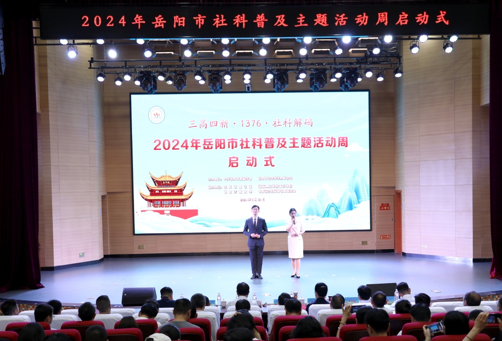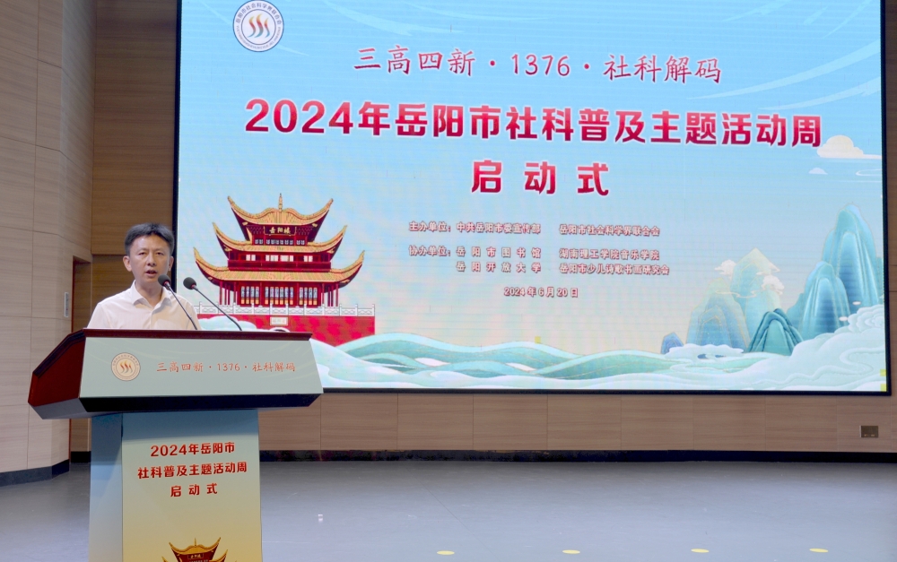6月20日,“三高四新·1376·社科解码”2024年岳阳市社科普及主题活动周启动式在市图书馆举行,省社科联党组书记、副主席(主持日常工作)胡代松出席并讲话,市委常委、市委宣传部部长刘启峰宣布活动启动,市政府副市长魏淑萍宣读岳阳市优秀社科普及基地、新晋社科普及基地通报,省社科联、主办协办单位有关负责人,市社科联兼职副主席,市社科普及工作联席会议制度成员单位负责人、部分在岳高校负责人、教师代表,各县市区委宣传部负责人,市社科界委员、社科智库专家代表,社科类社会组织、社科普及基地负责人等300多人参加活动。本次活动由市委宣传部、市社科联主办,市图书馆、岳阳开放大学、湖南理工学院音乐学院、市少儿诗歌书画研究会协办。