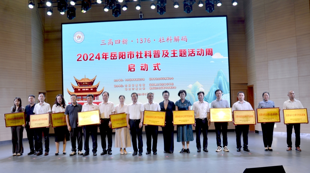 省市领导为岳阳市金鹗书院、岳阳市烈士陵园、汨罗市新市古镇书院、岳阳市婚姻家庭研究会等4个新晋岳阳市社科普及基地授牌;为岳阳市新华书店国学讲堂、湖南理工学院音乐学院湘楚音乐舞蹈传承研究基地、汨罗市大垅农耕文化博物馆等7个优秀社科普及基地颁奖。