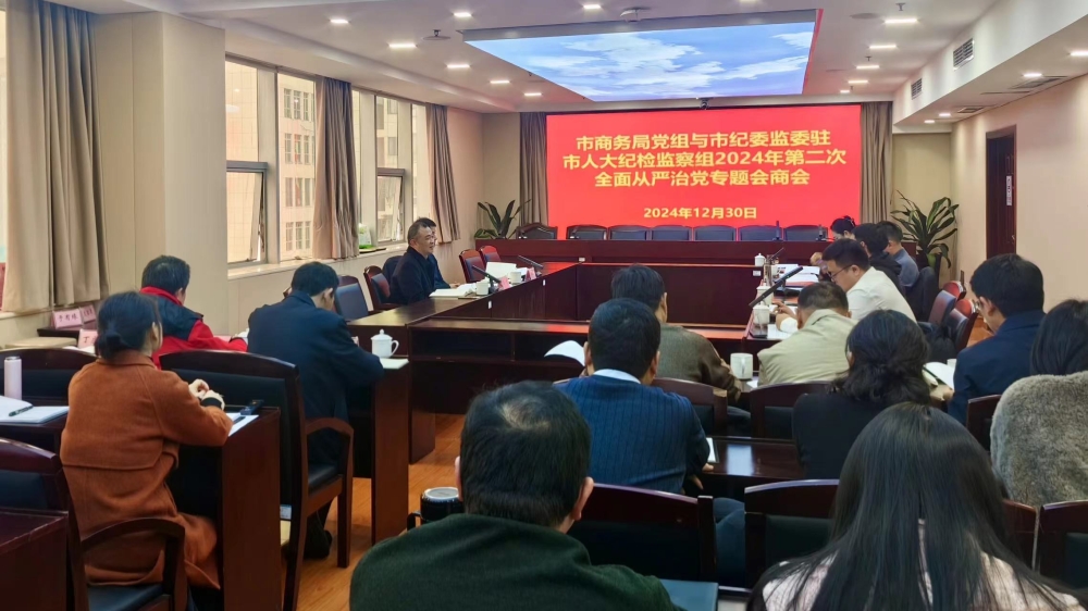 12月30日,市商务局党组与派驻纪检监察组召开2024年第二次全面从严治党专题会商会。局党组书记、局长潘宏军主持,市纪委监委驻市人大机关纪检监察组组长周勇、副组长陈艳东,局党组班子成员、副处级干部、机关各科室负责人,市投资促进事务中心主要负责人参加会议。