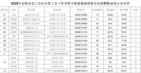 根据《2025年岳阳市总工会社会化工会工作者和专职集体协商指导员招聘公告》规定,经网上报名和资格初审、笔试、面试、体检等环节,确定白竟等14人为拟录用人员,现予以公示。