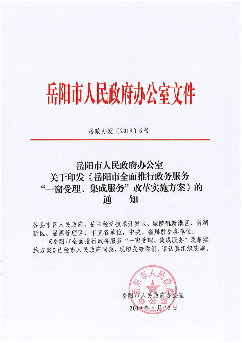 岳阳市人民政府办公室关于印发《岳阳市全面推行政务服务“一窗受理、集成服务”改革实施方案》的通知