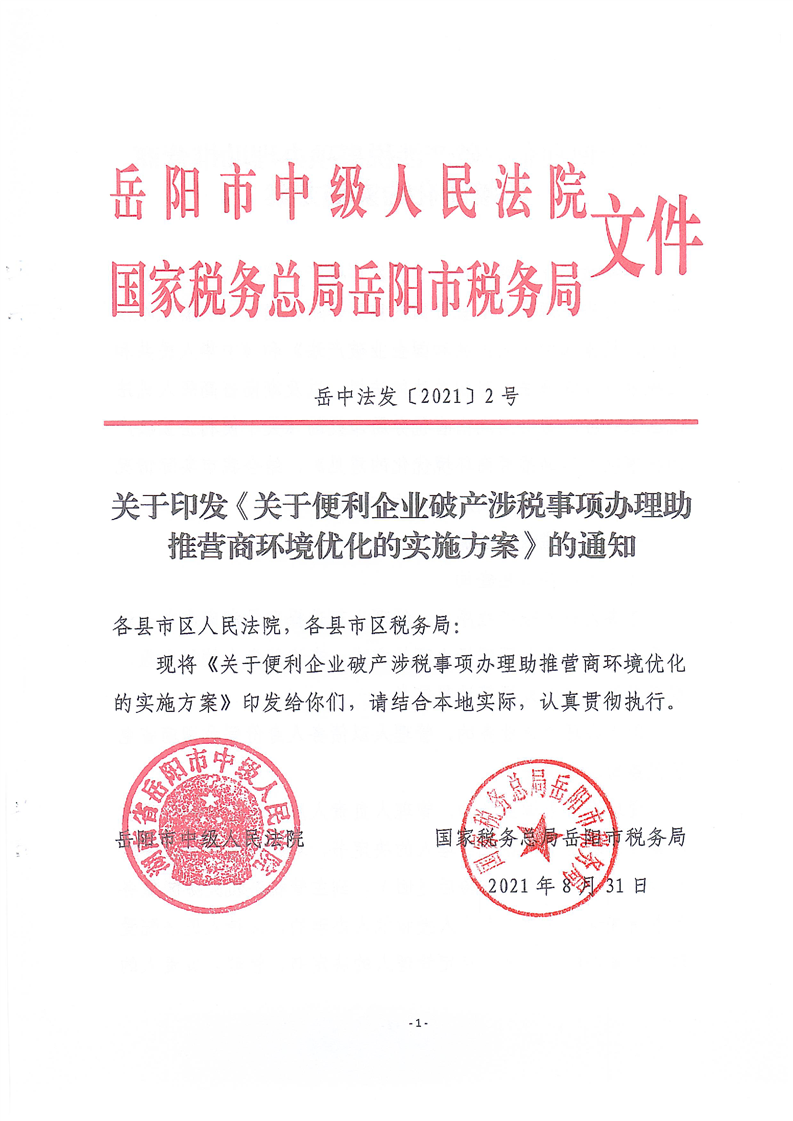 岳阳市中级人民法院、国家税务总局岳阳市税务局关于印发《关于便利企业破产涉税事项办理助推营商环境优化的实施方案》的通知